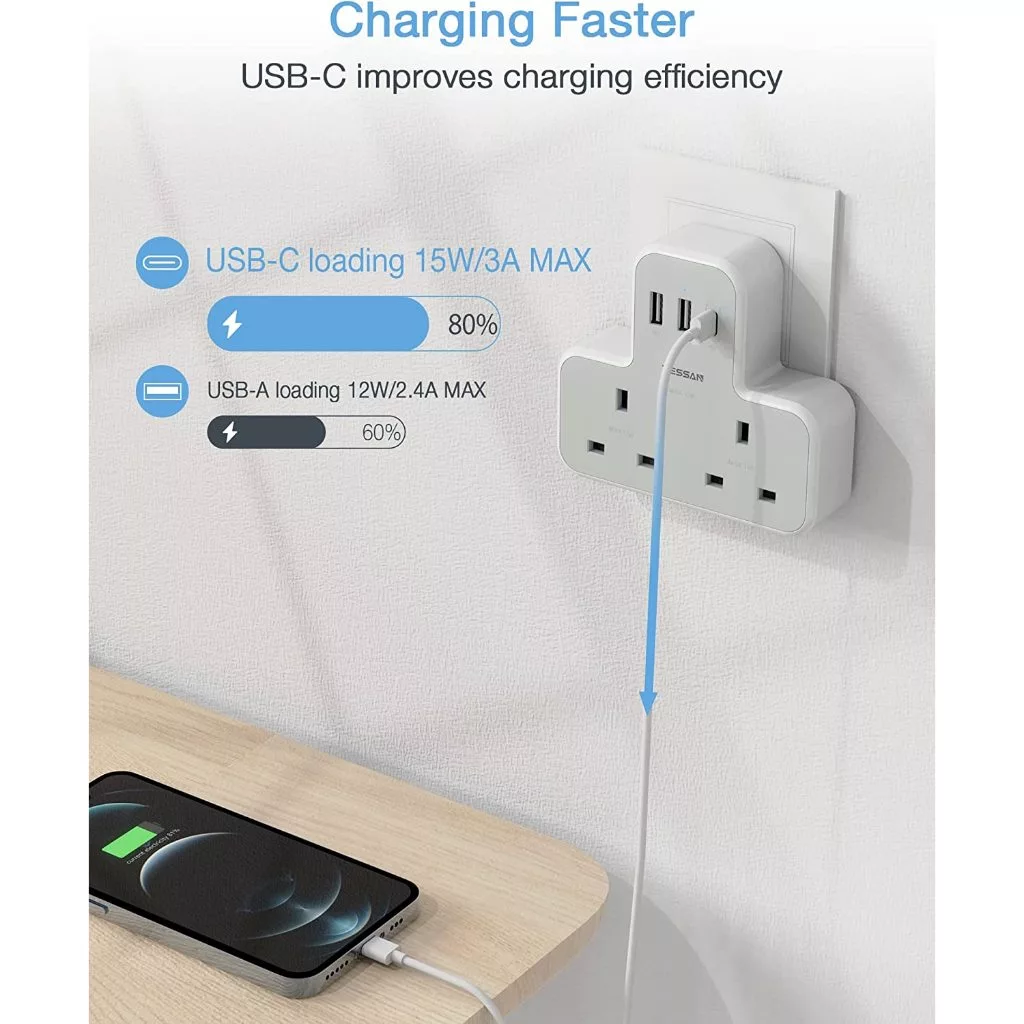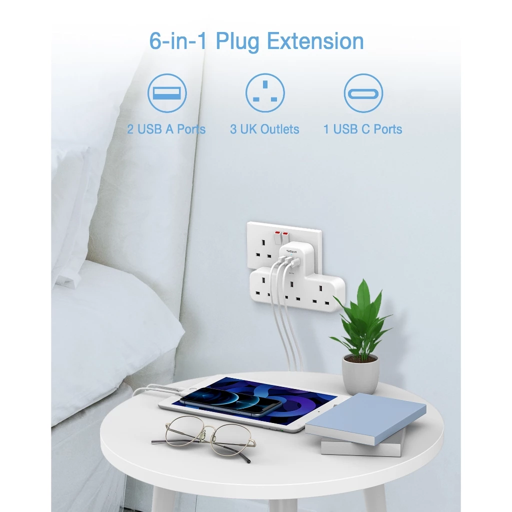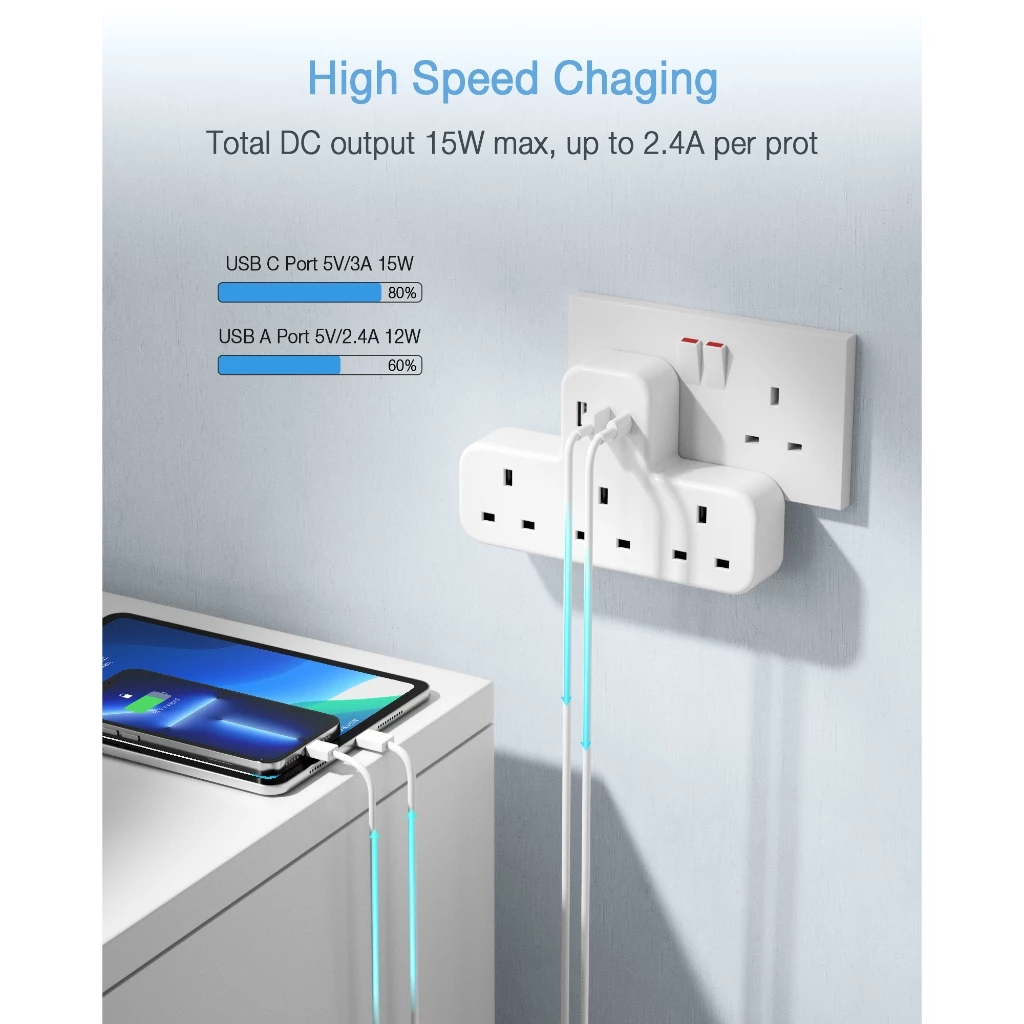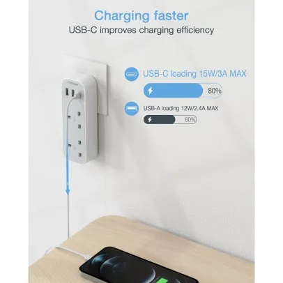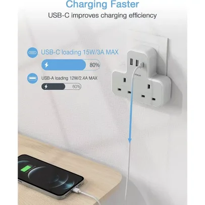 This socket adapter expands 1 outlet to 3 AC outlets and 2 USB A and 1 USB C charging ports which allow you to power up to 6 devices simultaneously. It’s easy to install and use by just plugging the adaptor plug in a wall socket. This portable adapter plug UK will meet your different requirements whether in living room, bedroom, bathroom, office, or while traveling.