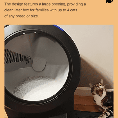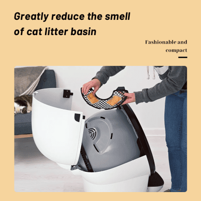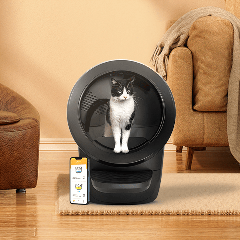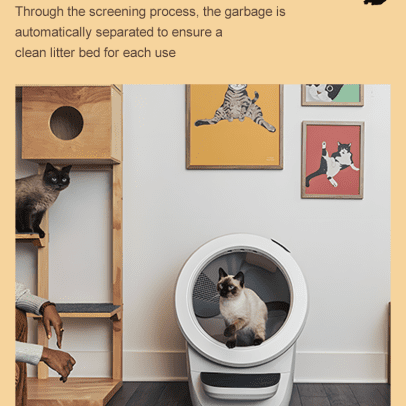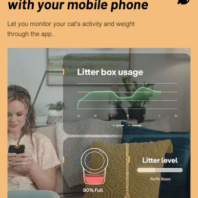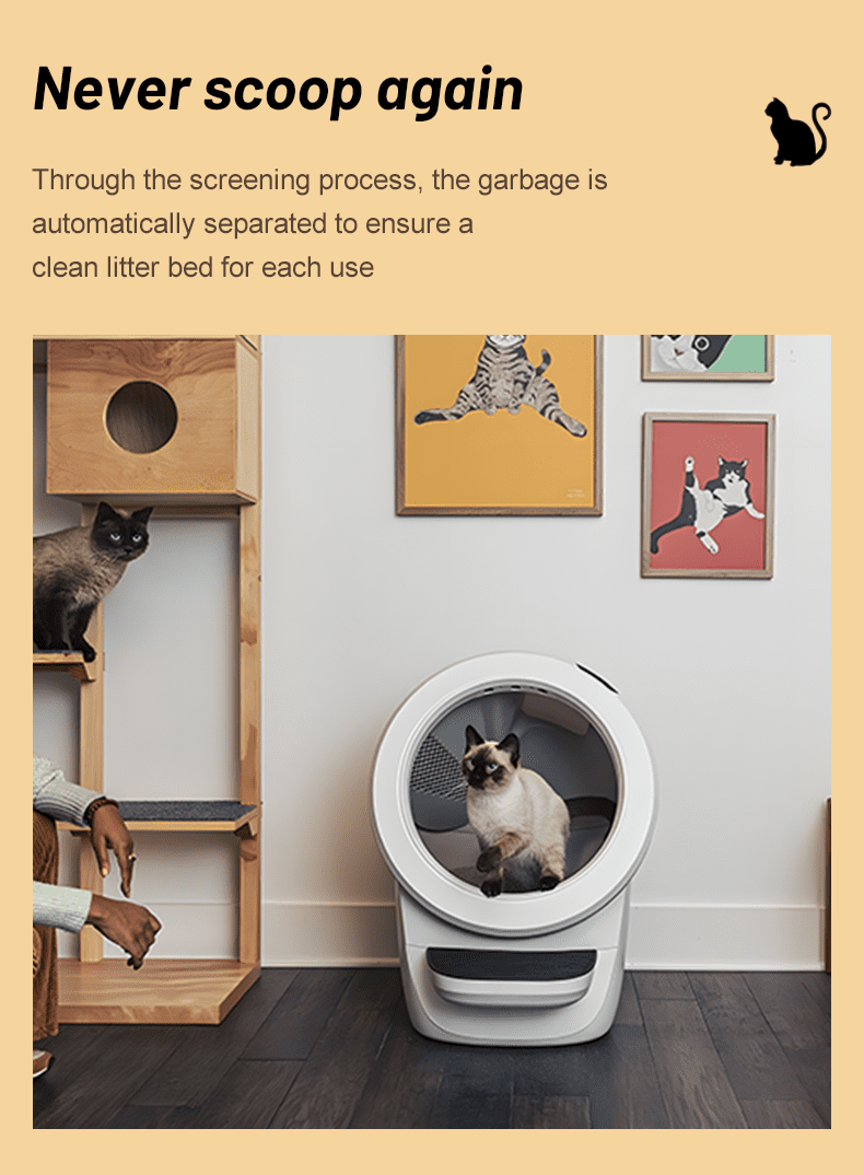 - 自清洁猫砂盆采用App(仅2.4ghz)远程或一键操控,自动将猫粪与干净的猫砂结块分离,并跟踪猫咪使用时间和猫砂用量,解决您短途出行的后顾之忧。