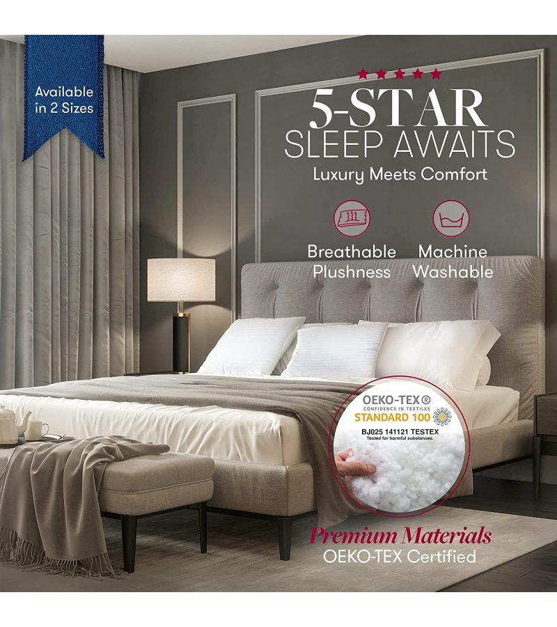 SAFE & SOUND – These fluffy Beckham Hotel Collection bed pillows are made in an OEKO-TEX Standard Certified factory that ensures textiles meet high safety and environmental standards.