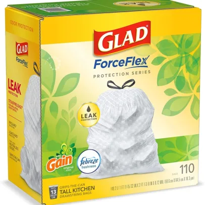13 gallon plastic trash BAGS: Glad tall kitchen drawstring trash bags with stretchable strength, traps, locks and neutralizes odors to keep your kitchen smelling fresh with a gain original Scent