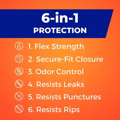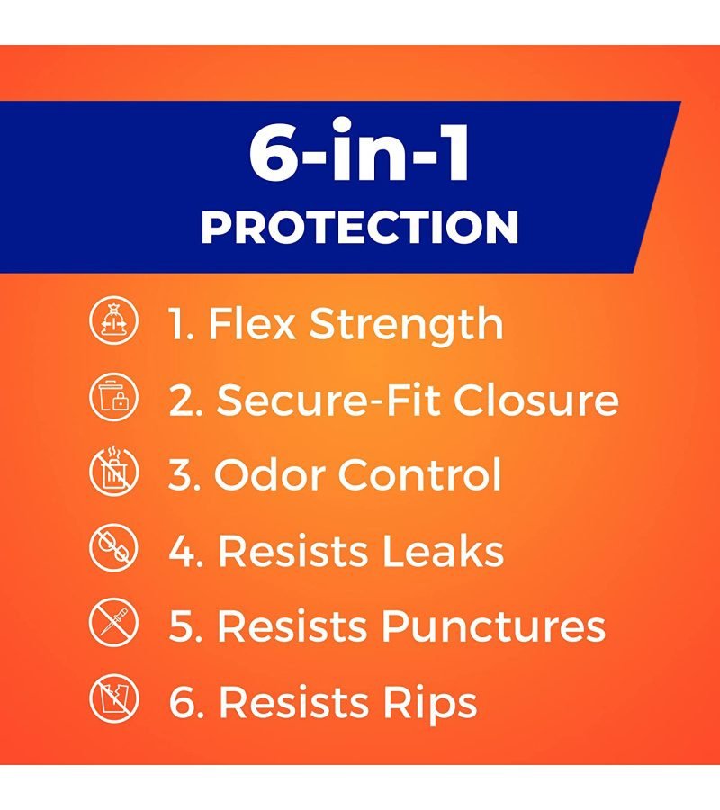TRIPLE-ACTION TECHNOLOGY—These kitchen garbage bags stretch and expand to accommodate oversized loads without punctures, leaks or tears