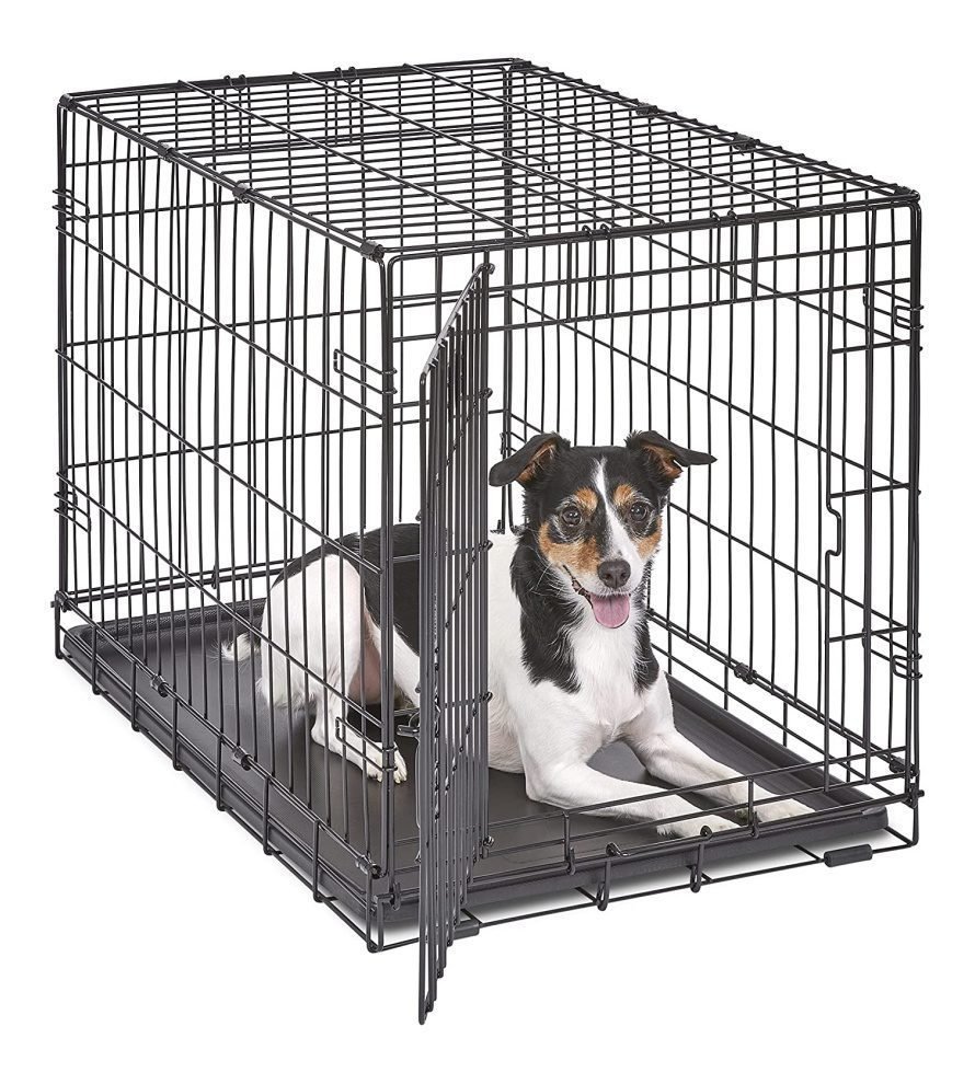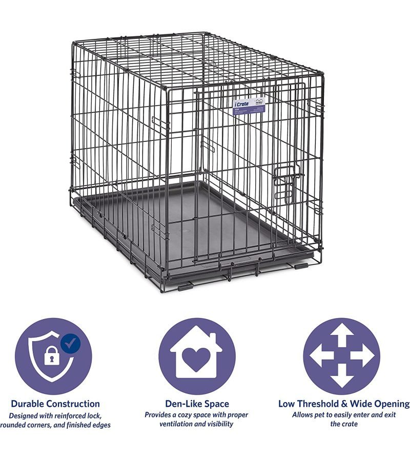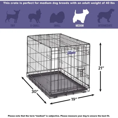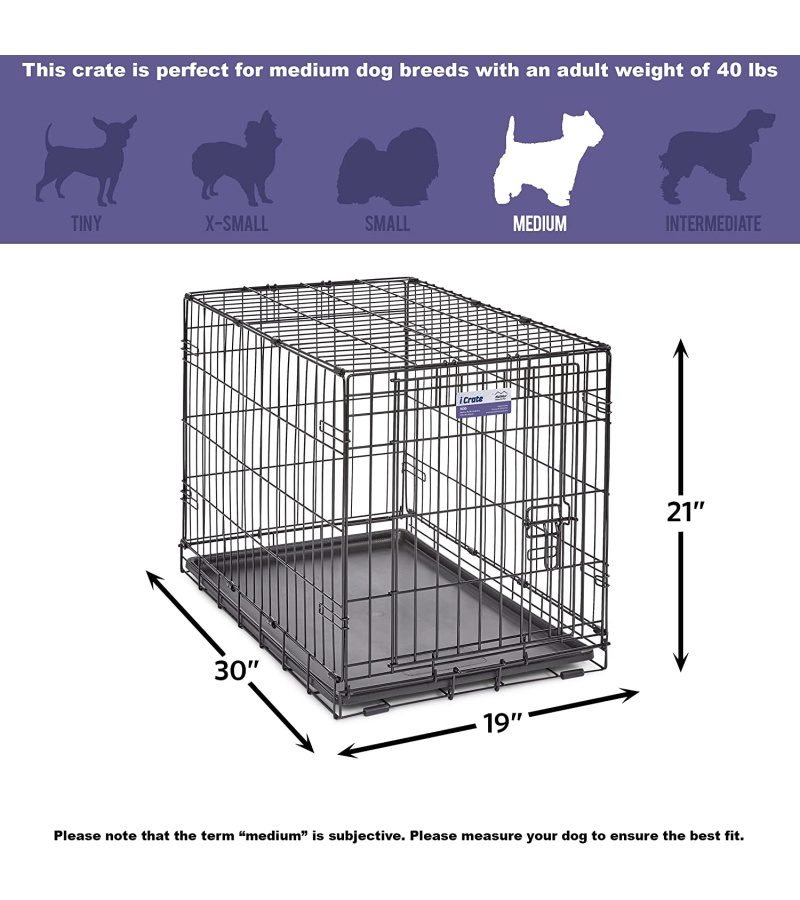 iCrate single door dog crate measures 30L x 19 x 21 inches and is suitable for medium dog breeds with an adult weight of 25 to 40 pounds. If your dog’s weight or measurements are on the higher side for this crate, we recommend buying the next crate size up