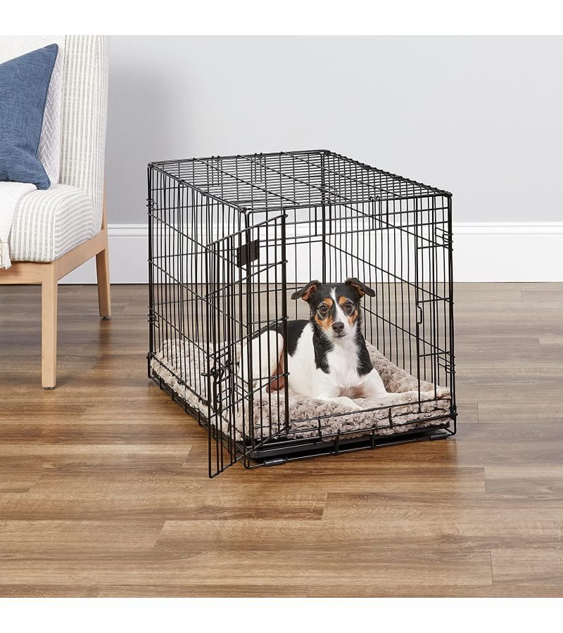 | Easy to Set Up — No Tools Required | Ultra-Soft Synthetic Fur Overstuffed Dog Bed | Hook & Loop Tabs Hold Cover Neatly in Place While Allowing Access to End & Side Doors on 1, 2 or 3 Door Crates | Strong & Durable Steel Frame Construction | Locks Securely to Reduce Water and Food Spills in Pet’s Living Area | |