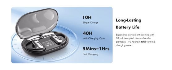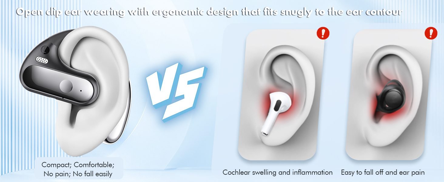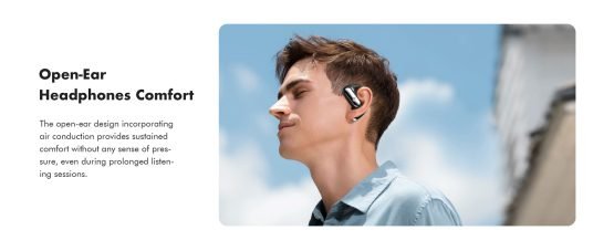 - Open-Ear Design for Ultimate Comfort – These wireless Bluetooth earphones feature an open-back design that leaves space around the ears, preventing a complete seal of the ear canal. This minimizes discomfort during extended wear. Their design applies less pressure to the ears and promotes ventilation, reducing sweat accumulation during activities like travel, sports, and hiking. Ideal for outdoor enthusiasts seeking both comfort and performance.