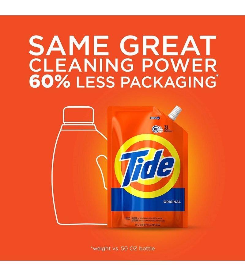 A convenient, easy to use pouch that uses 60% less packaging* and lets you reuse your empty Tide bottle. (*weight vs 50 oz. bottle)